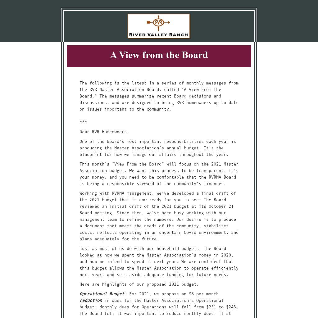 - November 14: In this e-mail, we are providing a link to the proposed 2021 budget, to allow you a chance to review it. <Click here> to see a summary of the proposed budget. After reviewing the budget, you can make comments on it at the November monthly Board meeting. Or, you can send your budget comments or questions ahead of the meeting via e-mail to General Manager Sterling Page (gm@rvrcommunity.com).