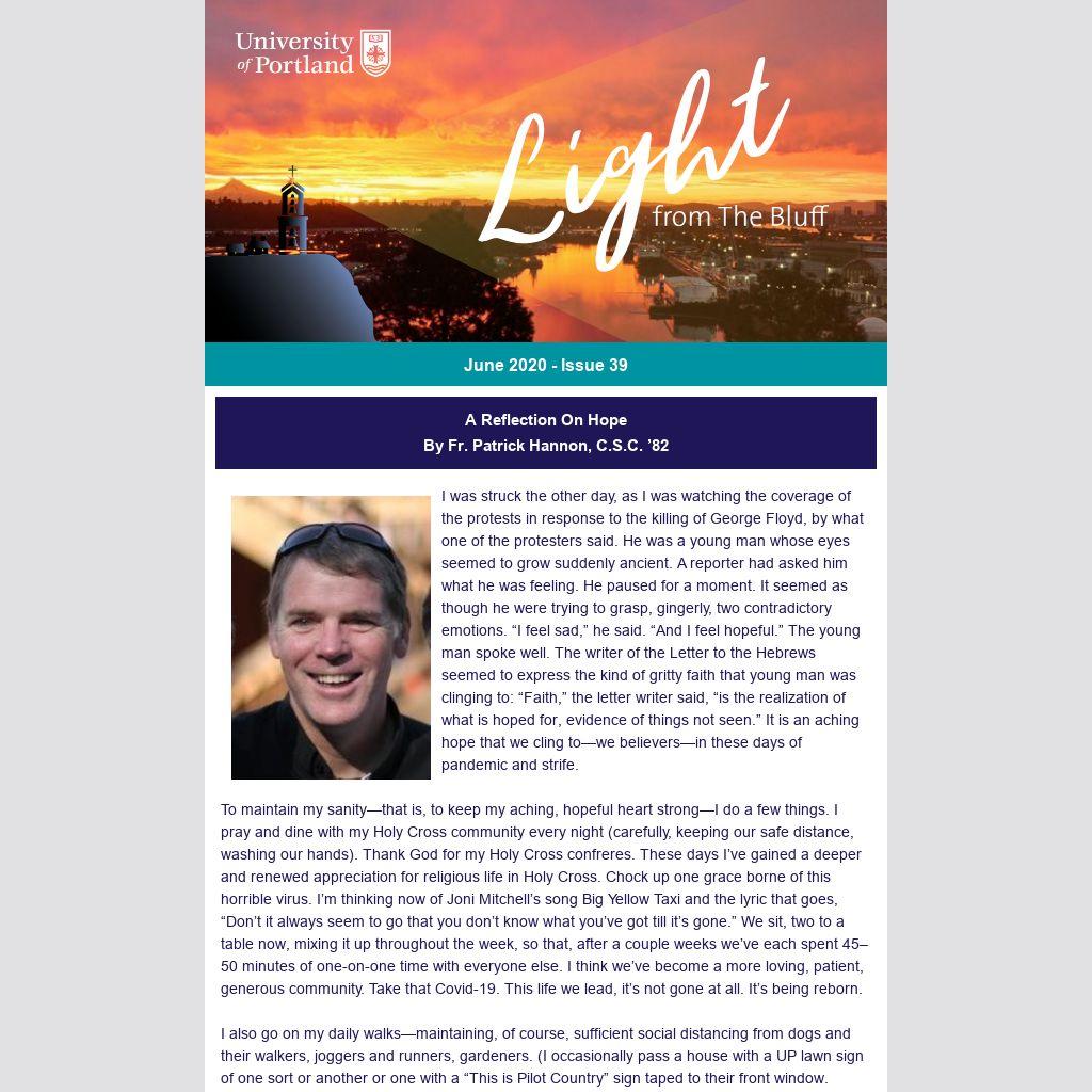 St. Augustine was purported to have said, “We are an Easter people and Alleluia is our song.” He is, of course, right, but I have to admit these days, I count it as evidence of the Holy Spirit working in me when I sing "Alleluia!" at Mass or prayer. I take a glimpse outside my Christie Hall window and onto a world reeling, frightened, frustrated. I see all these Brendans out there, suffering silently, alone, wondering if they’re going to make it. It still feels like Lent to me. Perhaps it will for a long while. But then I think of Ryan, who, on one lonely night, outflanked fear and reached lovingly across a great divide and found—and this I hope—that his life was not gone at all. And neither was Brendan’s. They were, on that pier, being reborn.