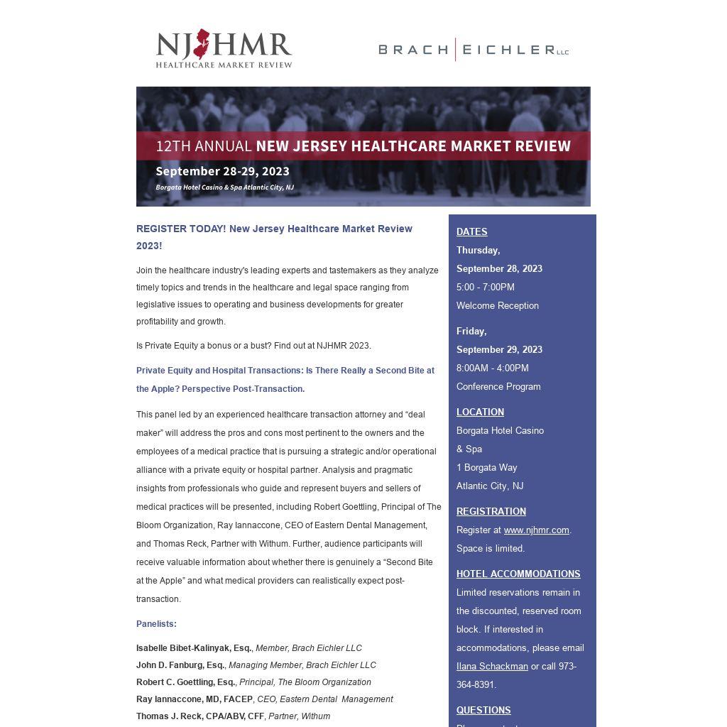 Please join Brach Eichler for its premier healthcare conference, the 2023 New Jersey Healthcare Market Review, September 28-29, 2023 at the Borgata Hotel Casino & Spa in Atlantic City, NJ.