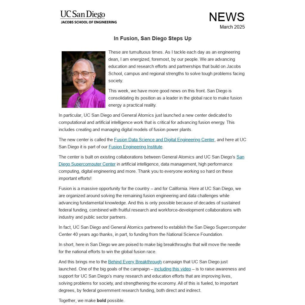 These are tumultuous times. As I tackle each day as an engineering dean, I am energized, foremost, by our people. We are advancing education and research efforts and partnerships that build on Jacobs School, campus and regional strengths to solve tough problems facing society.