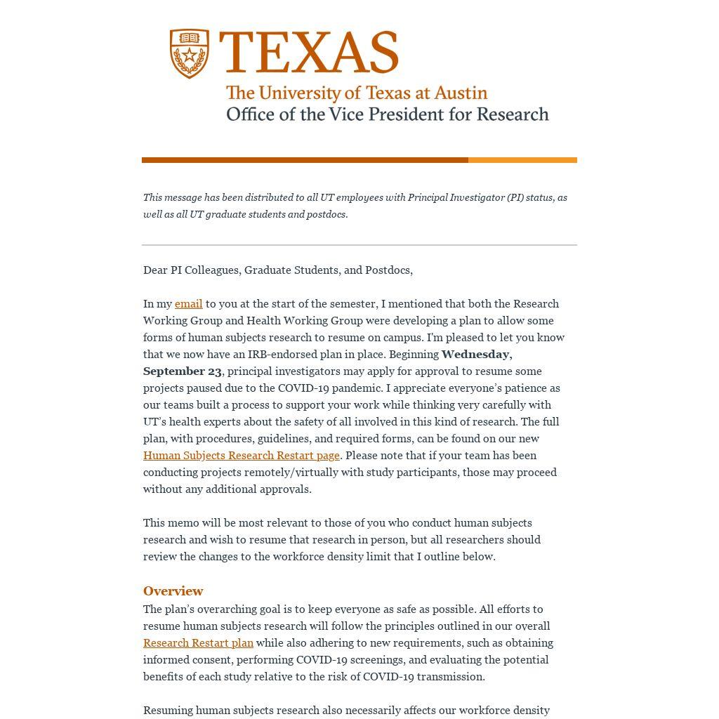 In my email to you at the start of the semester, I mentioned that both the Research Working Group and Health Working Group were developing a plan to allow some forms of human subjects research to resume on campus. I'm pleased to let you know that we now have an IRB-endorsed plan in place. Beginning Wednesday, September 23, principal investigators may apply for approval to resume some projects paused due to the COVID-19 pandemic. I appreciate everyone’s patience as our teams built a process to support your work while thinking very carefully with UT’s health experts about the safety of all involved in this kind of research. The full plan, with procedures, guidelines, and required forms, can be found on our new Human Subjects Research Restart page. Please note that if your team has been conducting projects remotely/virtually with study participants, those may proceed without any additional approvals.