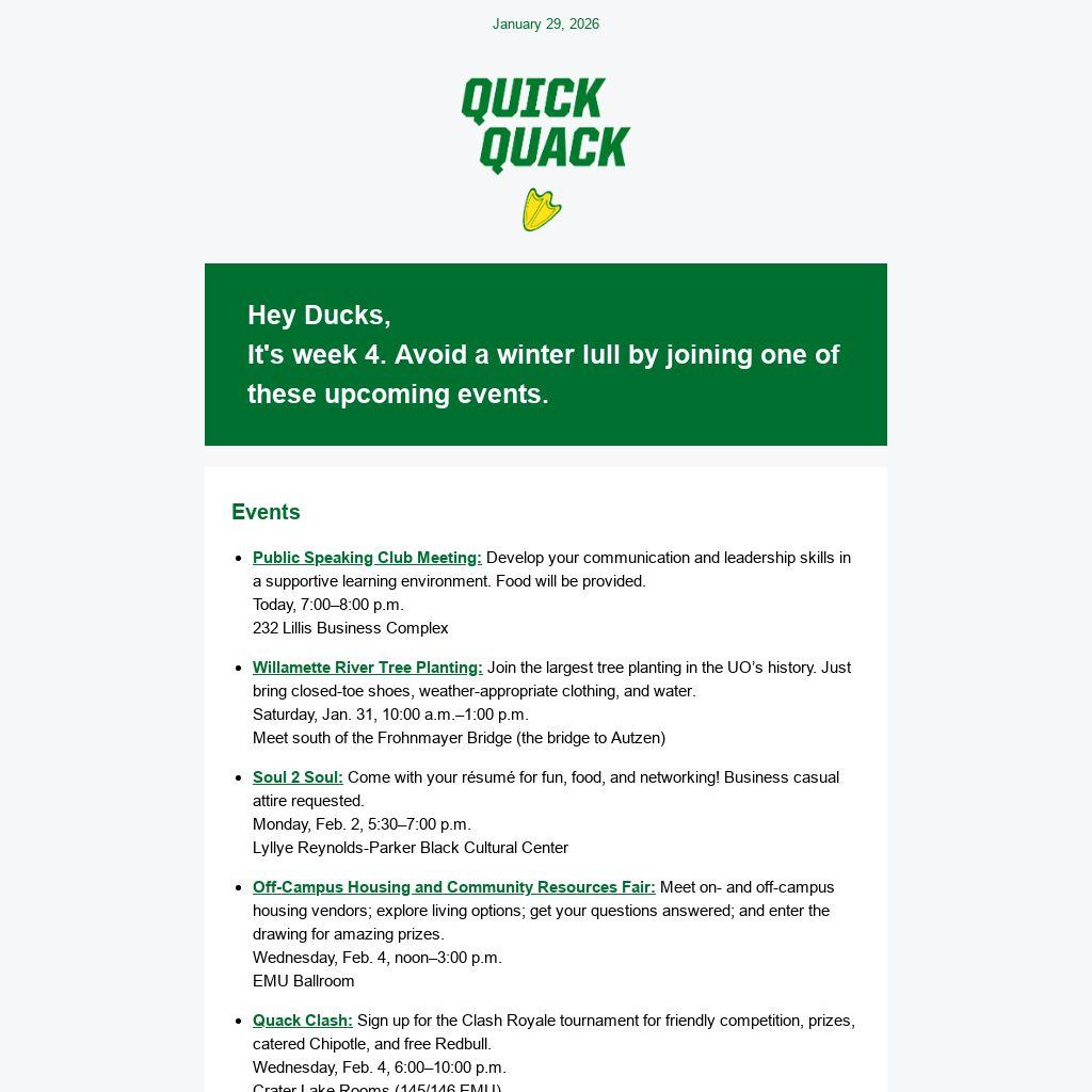Quack Clash: Sign up for the Clash Royale tournament for friendly competition, prizes, catered Chipotle, and free Redbull.