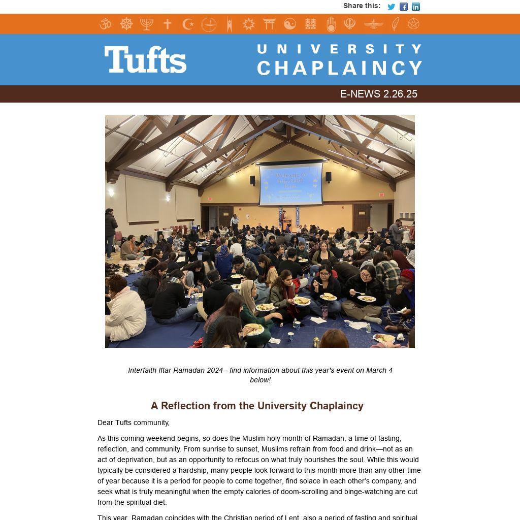 Tufts Muslim Chaplaincy and The Muslim Students Association (MSA) invite students, faculty, and staff to join us for breaking the fast at sunset on March 4, at Breed Hall at 5:30 p.m. Ramadan is the holy month of fasting for Muslims around the world, and it is a time of reflection and spiritual discernment that the Muslim community would like to share, along with a delicious halal meal, with our friends and neighbors throughout the University. Contact Muslim Chaplain Khan Shairani with any questions.