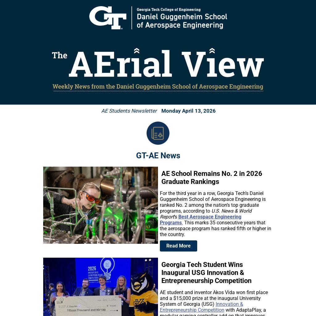 For the third year in a row, Georgia Tech’s Daniel Guggenheim School of Aerospace Engineering is ranked No. 2 among the nation’s top graduate programs, according to U.S. News & World Report’s Best Aerospace Engineering Programs. This marks 35 consecutive years that the aerospace program has ranked fifth or higher in the country.