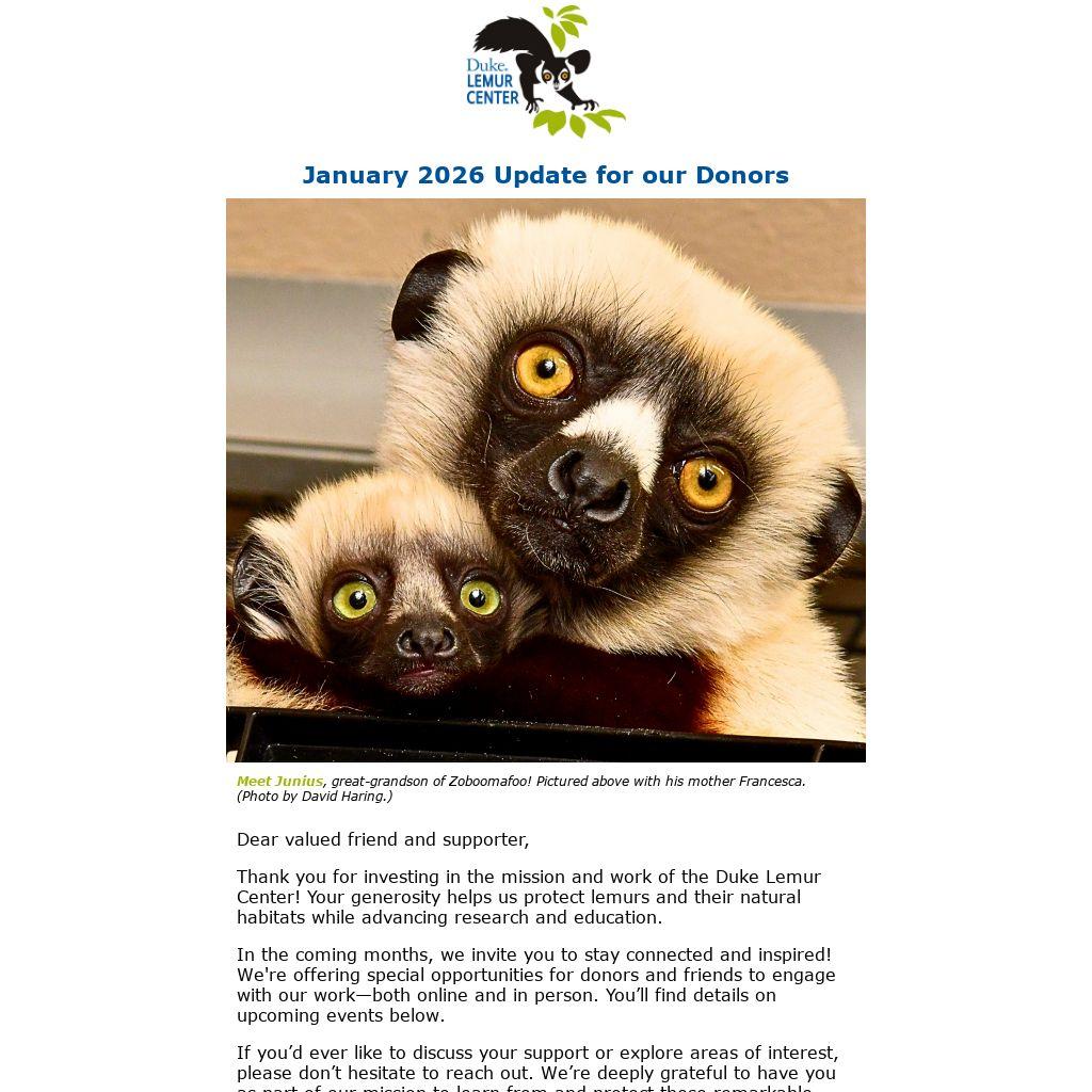 Thank you for investing in the mission and work of the Duke Lemur Center! Your generosity helps us protect lemurs and their natural habitats while advancing research and education.