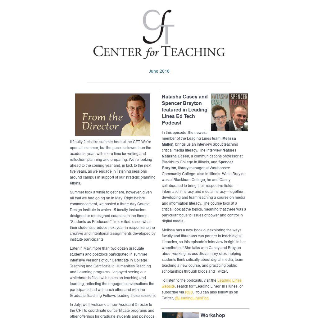 | It finally feels like summer here at the CFT. We’re open all summer, but the pace is slower than the academic year, with more time for writing and reflection, planning and preparing. We’re looking ahead to the coming year and, in fact, to the next five years, as we engage in listening sessions around campus in support of our strategic planning efforts. Summer took a while to get here, however, given all that we had going on in May. Right before commencement, we hosted a three-day Course Design Institute in which 15 faculty instructors designed or redesigned courses on the theme “Students as Producers.” I’m excited to see what their students produce next year in response to the creative and intentional assignments developed by institute participants. Later in May, more than two dozen graduate students and postdocs participated in summer intensive versions of our Certificate in College Teaching and Certificate in Humanities Teaching and Learning programs. I enjoyed seeing our whiteboards filled with notes on teaching and learning, reflecting the engaged conversations the participants had with each other and with the Graduate Teaching Fellows leading these sessions. In July, we’ll welcome a new Assistant Director to the CFT to coordinate our certificate programs and other offerings for graduate students and postdocs. Heather Fedesco joins us from Colorado College, where she was a Mellon Foundation pedagogy researcher exploring student motivation and learning. Prior to that, Heather taught in the Brian Lamb School of Communication at Purdue University and served as a post-doctoral research associate at the Center for Instructional Excellence at Purdue. Also joining the team this summer is Grant Neal, our new Lead Instructional Technologist. Grant comes to us from 2U, where he helped instructors make revisions to existing online courses. Prior to that, Grant supported online instruction at Trevecca Nazarene University and Cumberland University, among other institutions. Grant will be a key member of the CFT’s Brightspace support team, helping instructors use Brightspace to enhance their on-campus teaching. In other staff news, I’m happy to announce a promotion to Associate Director for Cynthia Brame in recognition of her work with the Vanderbilt teaching community, her leadership of CFT programs, and her scholarship in teaching and learning. Please join me in congratulating Cynthia and in welcoming Heather and Grant to Vanderbilt. Enjoy your summer! I hope it’s somehow both relaxing and productive. And please let us know if we can help you as you prepare for the fall.