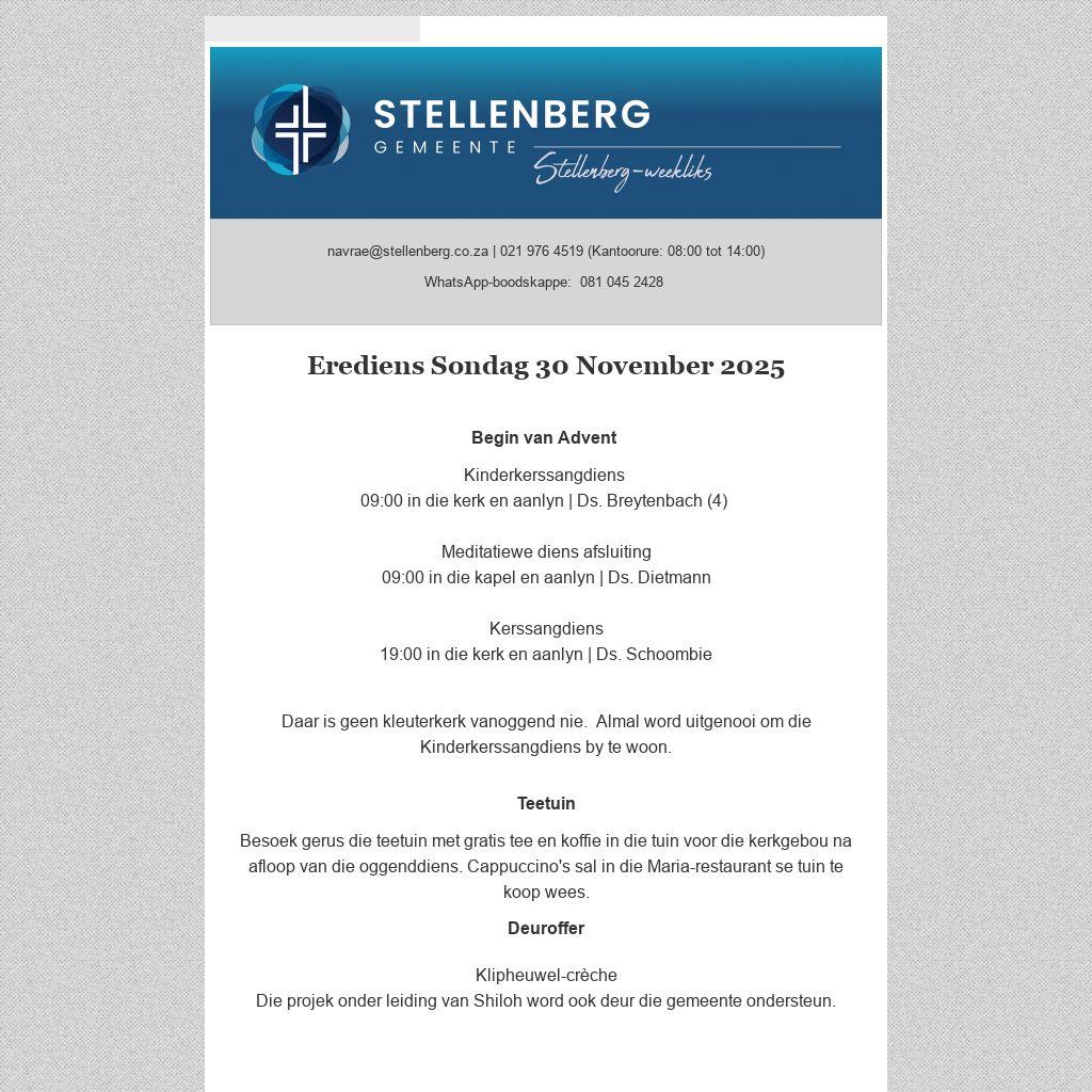 Plaas gerus ’n advertensie in die Stellenberg-weekliks. Die nuusblad word tans weekliks elektronies aan 2 500 persone gestuur en is ook op die gemeente se webwerf beskikbaar. Advertensies sal slegs aanlyn beskikbaar wees en word nie in gedrukte formaat uitgegee nie. Lees meer . . .