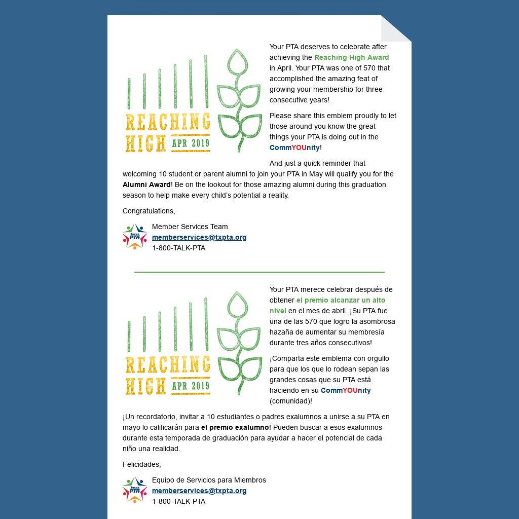 ¡Un recordatorio, invitar a 10 estudiantes o padres exalumnos a unirse a su PTA en mayo lo calificarán para el premio exalumno! Pueden buscar a esos exalumnos durante esta temporada de graduación para ayudar a hacer el potencial de cada niño una realidad.