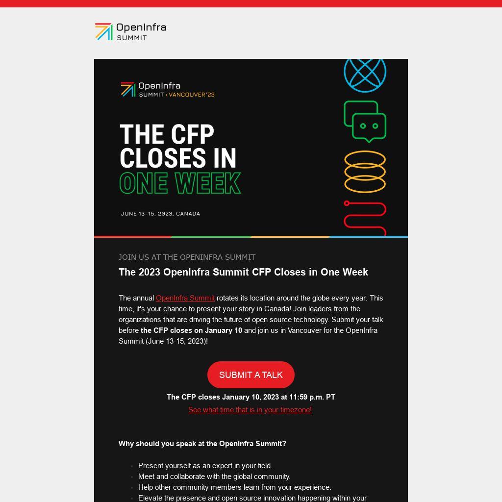 The annual OpenInfra Summit rotates its location around the globe every year. This time, it's your chance to present your story in Canada! Join leaders from the organizations that are driving the future of open source technology. Submit your talk before the CFP closes on January 10 and join us in Vancouver for the OpenInfra Summit (June 13-15, 2023)!