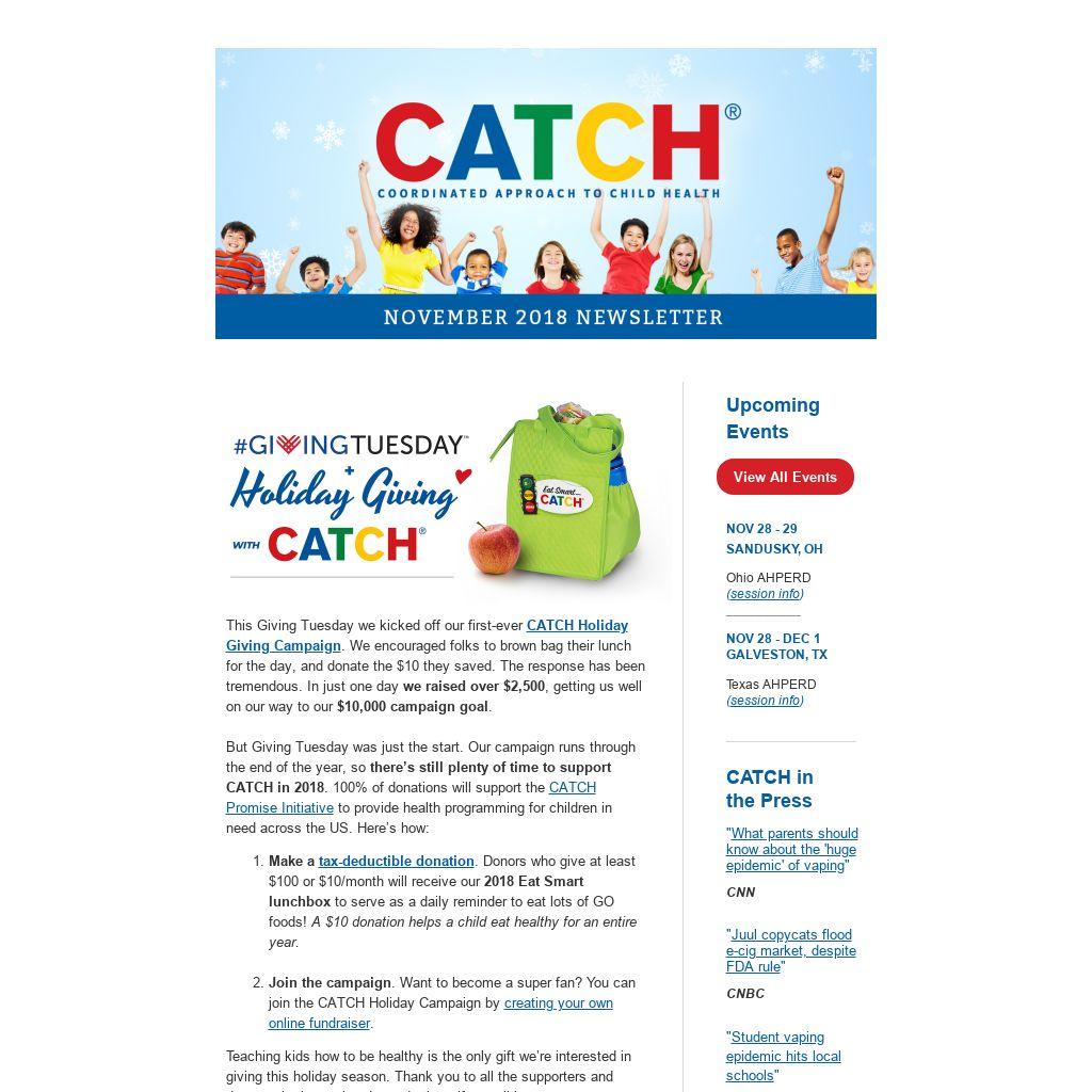 But Giving Tuesday was just the start. Our campaign runs through the end of the year, so there’s still plenty of time to support CATCH in 2018. 100% of donations will support the CATCH Promise Initiative to provide health programming for children in need across the US. Here’s how: - Make a tax-deductible donation. Donors who give at least $100 or $10/month will receive our 2018 Eat Smart lunchbox to serve as a daily reminder to eat lots of GO foods! A $10 donation helps a child eat healthy for an entire year.