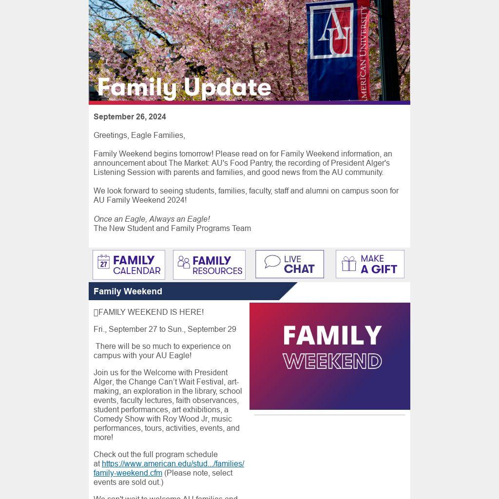 Family Weekend begins tomorrow! Please read on for Family Weekend information, an announcement about The Market: AU's Food Pantry, the recording of President Alger's Listening Session with parents and families, and good news from the AU community.