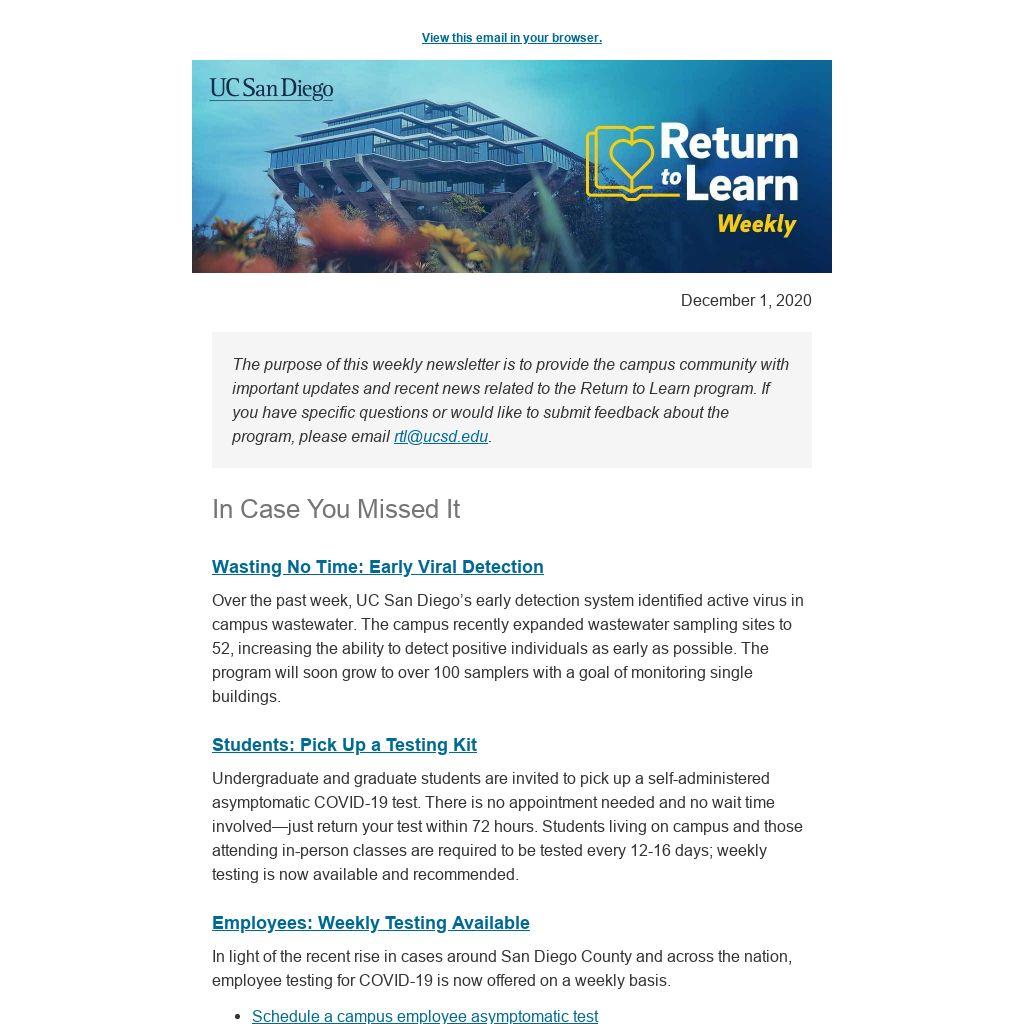 maintained a very low student positivity rate of 0.5%. In following county health orders, UC San Diego has transitioned all in-person classes into outdoor teaching spaces or remote-only formats. In addition, students who live on campus are required to wear a mask at all times within their apartments and suites, except in their own private bedrooms and in the shower, as well as whenever they leave their residence.