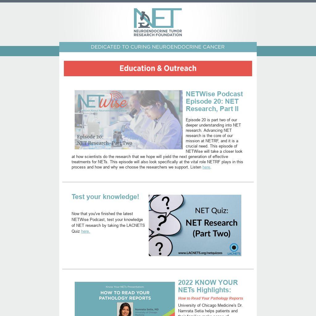 Episode 20 is part two of our deeper understanding into NET research. Advancing NET research is the core of our mission at NETRF, and it is a crucial need. This episode of NETWise will take a closer look at how scientists do the research that we hope will yield the next generation of effective treatments for NETs. This episode will also look specifically at the vital role NETRF plays in this process and how and why we choose the researchers we support. Listen here.