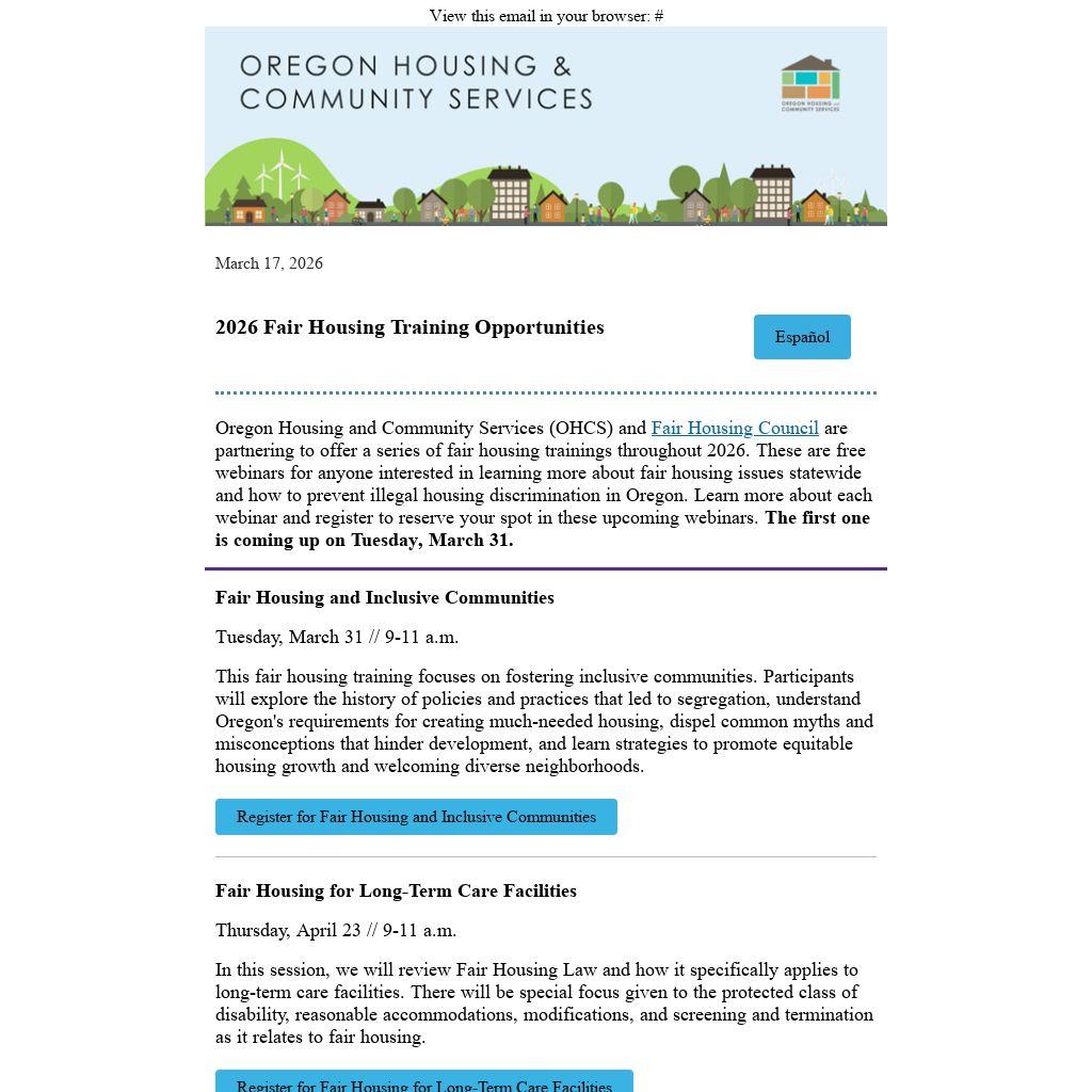 Oregon Housing and Community Services (OHCS) and Fair Housing Council are partnering to offer a series of fair housing trainings throughout 2026. These are free webinars for anyone interested in learning more about fair housing issues statewide and how to prevent illegal housing discrimination in Oregon. Learn more about each webinar and register to reserve your spot in these upcoming webinars. The first one is coming up on Tuesday, March 31.