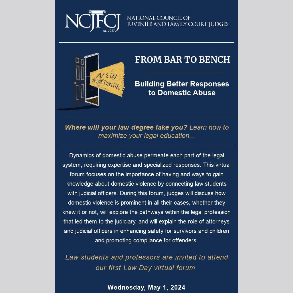 Dynamics of domestic abuse permeate each part of the legal system, requiring expertise and specialized responses. This virtual forum focuses on the importance of having and ways to gain knowledge about domestic violence by connecting law students with judicial officers. During this forum, judges will discuss how domestic violence is prominent in all their cases, whether they knew it or not, will explore the pathways within the legal profession that led them to the judiciary, and will explain the role of attorneys and judicial officers in enhancing safety for survivors and children and promoting compliance for offenders.