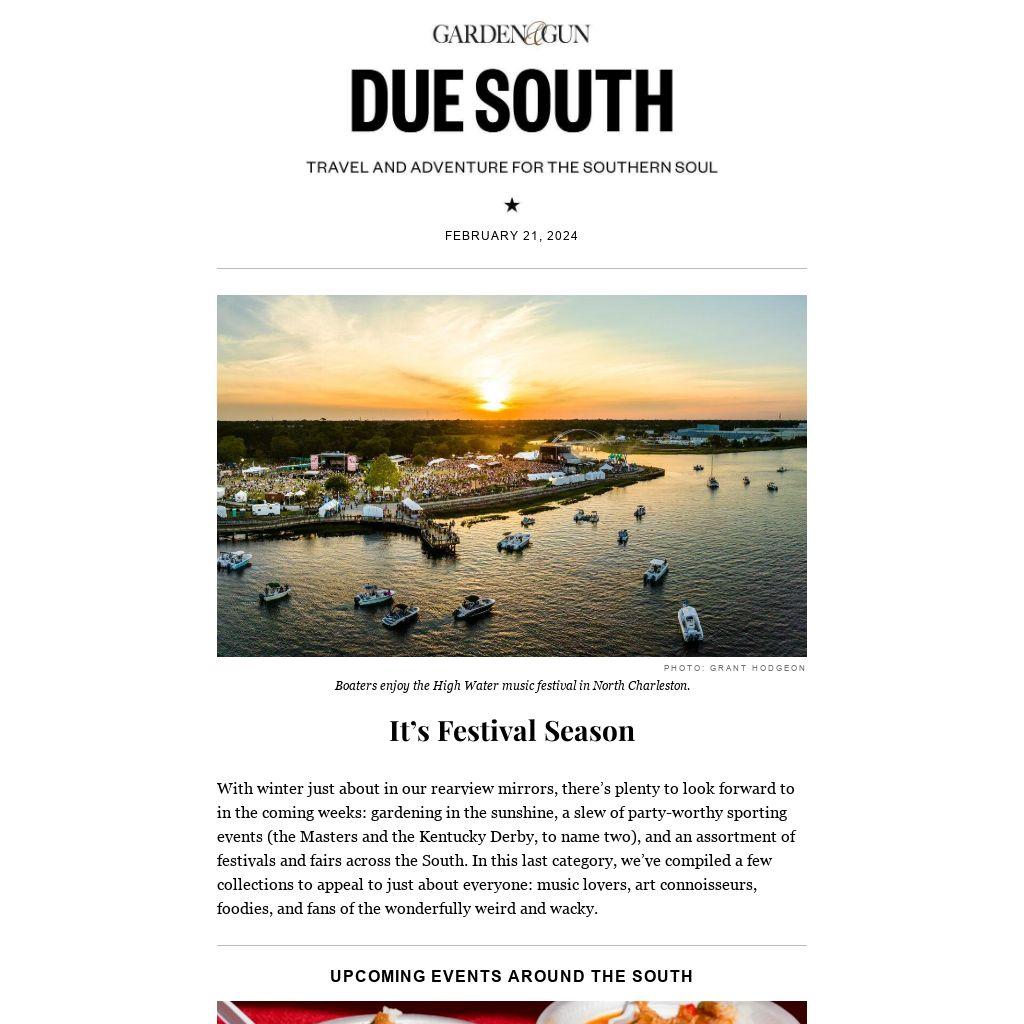 With winter just about in our rearview mirrors, there’s plenty to look forward to in the coming weeks: gardening in the sunshine, a slew of party-worthy sporting events (the Masters and the Kentucky Derby, to name two), and an assortment of festivals and fairs across the South. In this last category, we’ve compiled a few collections to appeal to just about everyone: music lovers, art connoisseurs, foodies, and fans of the wonderfully weird and wacky.