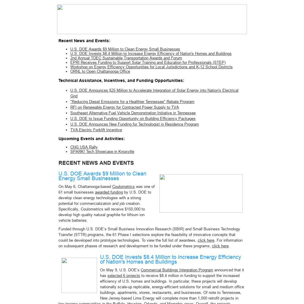 On May 9, U.S. DOE’s Commercial Buildings Integration Program announced that it has selected 6 projects to receive $8.4 million in funding to support the increased efficiency of U.S. homes and buildings. In particular, these projects will develop nationally scale-up replicable, energy-efficient solutions for small and medium office buildings, apartments, stores, restaurants, and businesses. Of note to Tennessee, New Jersey-based Lime Energy will complete more than 1,000 retrofit projects in low-income communities in the Buffalo, Houston, Orlando, and Memphis areas. Overall, the projects selected for funding will improve the efficiency of at least 2,600 buildings nationwide and leverage almost $17 million in partner resources.