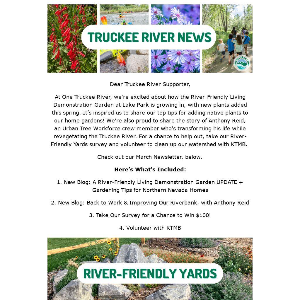 At One Truckee River, we're excited about how the River-Friendly Living Demonstration Garden at Lake Park is growing in, with new plants added this spring. It’s inspired us to share our top tips for adding native plants to our home gardens! We’re also proud to share the story of Anthony Reid, an Urban Tree Workforce crew member who’s transforming his life while revegetating the Truckee River. For a chance to help out, take our River-Friendly Yards survey and volunteer to clean up our watershed with KTMB.