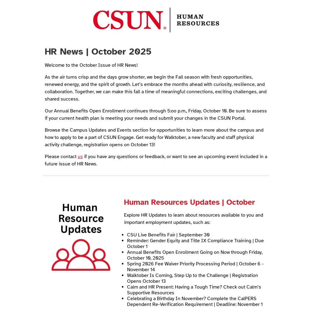 Browse the Campus Updates and Events section for opportunities to learn more about the campus and how to apply to be a part of CSUN Engage. Get ready for Walktober, a new faculty and staff physical activity challenge, registration opens on October 13!