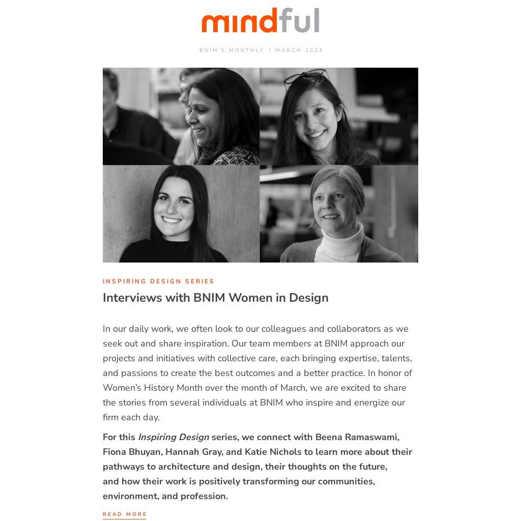 In our daily work, we often look to our colleagues and collaborators as we seek out and share inspiration. Our team members at BNIM approach our projects and initiatives with collective care, each bringing expertise, talents, and passions to create the best outcomes and a better practice. In honor of Women’s History Month over the month of March, we are excited to share the stories from several individuals at BNIM who inspire and energize our firm each day.