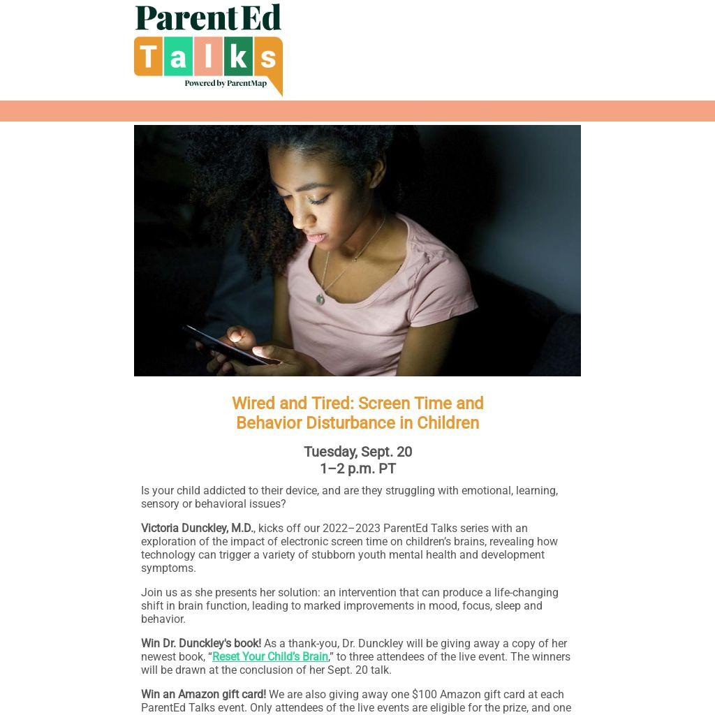 Win an Amazon gift card! We are also giving away one $100 Amazon gift card at each ParentEd Talks event. Only attendees of the live events are eligible for the prize, and one winner will be drawn at the end of each talk.