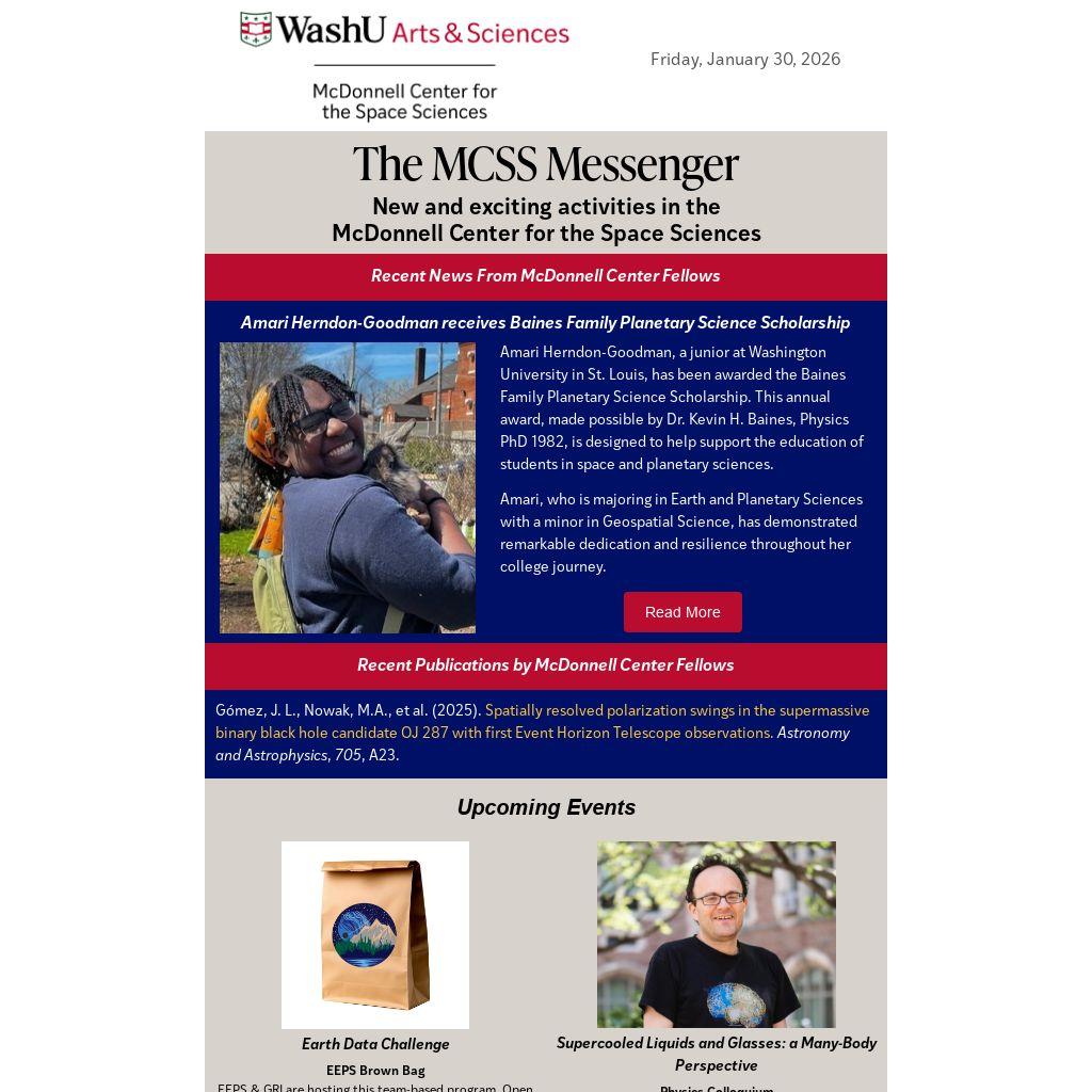 Amari Herndon-Goodman, a junior at Washington University in St. Louis, has been awarded the Baines Family Planetary Science Scholarship. This annual award, made possible by Dr. Kevin H. Baines, Physics PhD 1982, is designed to help support the education of students in space and planetary sciences.