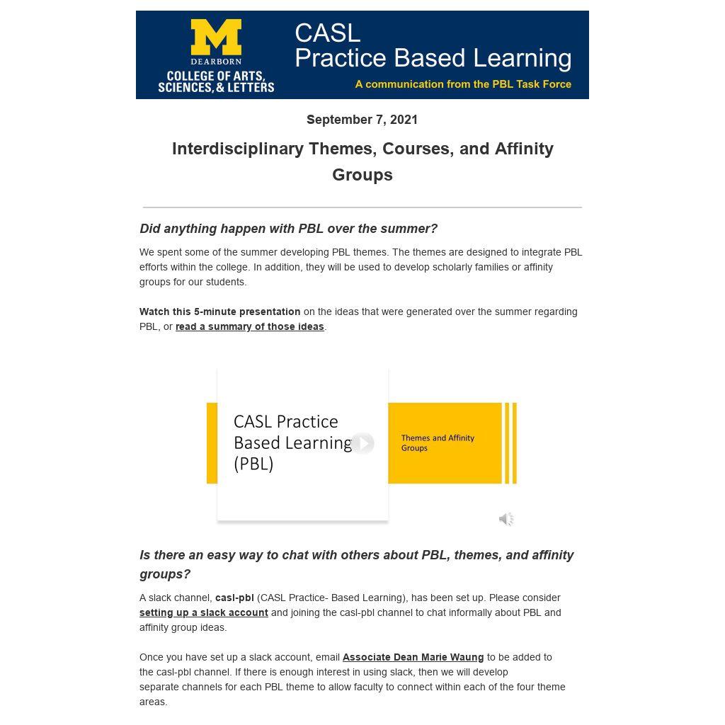 A slack channel, casl-pbl (CASL Practice- Based Learning), has been set up. Please consider setting up a slack account and joining the casl-pbl channel to chat informally about PBL and affinity group ideas.