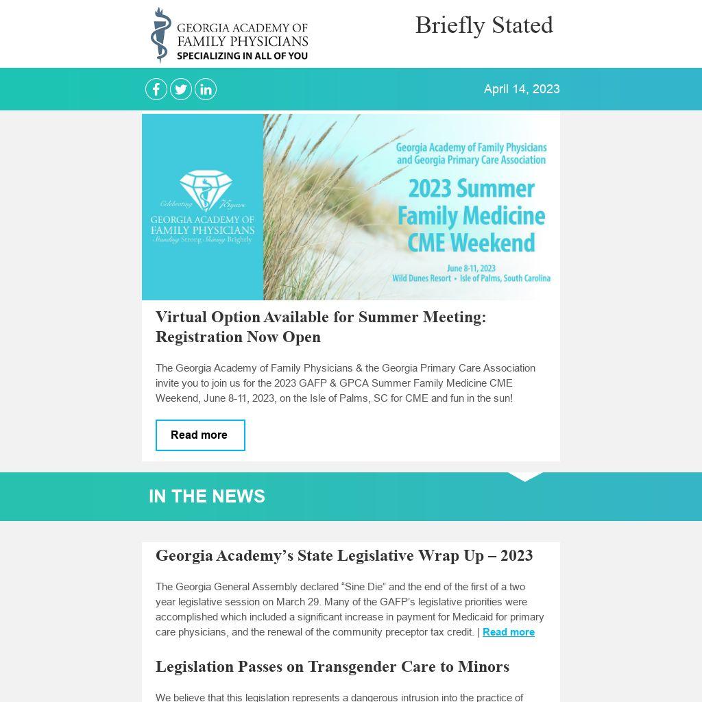 The Georgia General Assembly declared “Sine Die” and the end of the first of a two year legislative session on March 29. Many of the GAFP’s legislative priorities were accomplished which included a significant increase in payment for Medicaid for primary care physicians, and the renewal of the community preceptor tax credit. | Read more