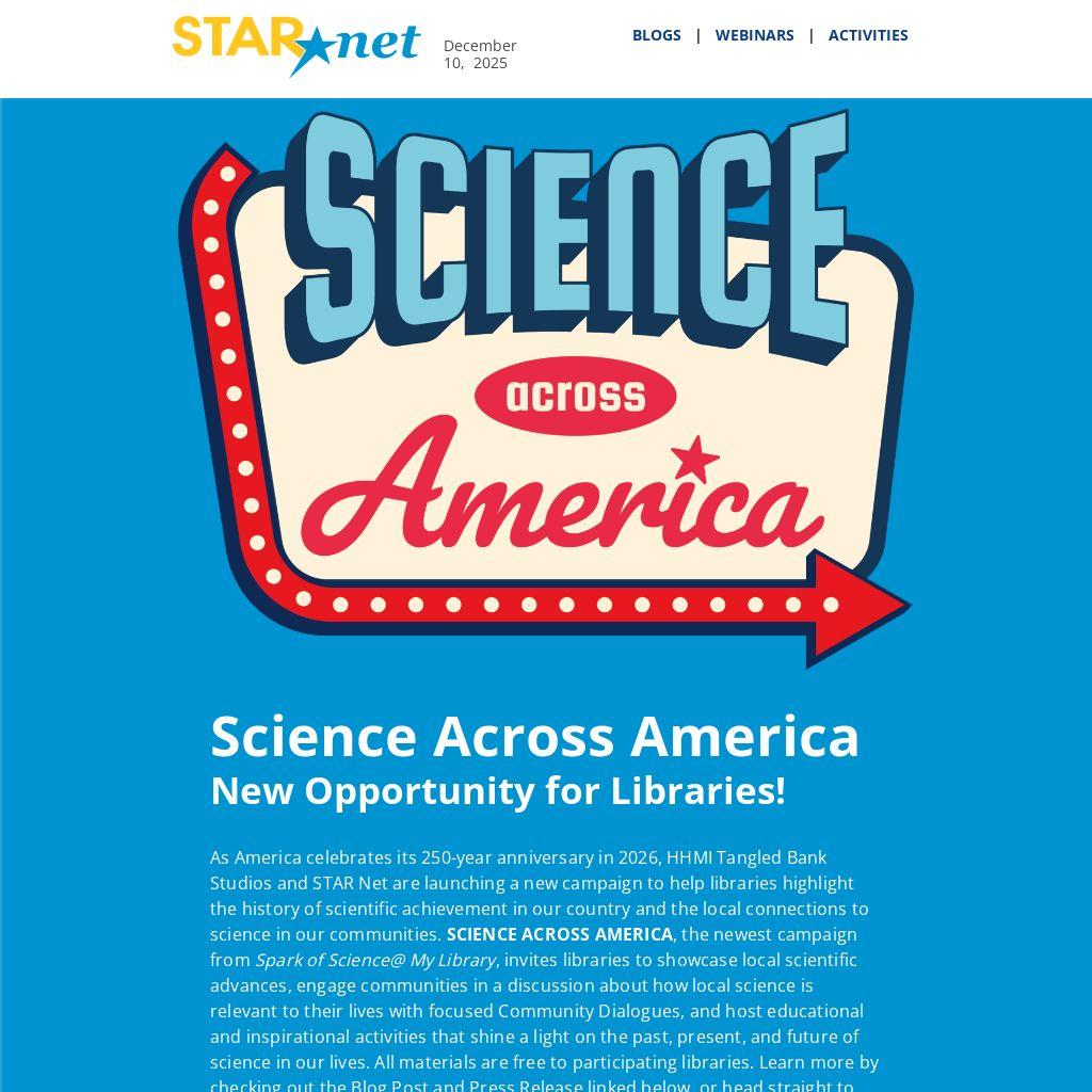 As America celebrates its 250-year anniversary in 2026, HHMI Tangled Bank Studios and STAR Net are launching a new campaign to help libraries highlight the history of scientific achievement in our country and the local connections to science in our communities. SCIENCE ACROSS AMERICA, the newest campaign from Spark of Science@ My Library, invites libraries to showcase local scientific advances, engage communities in a discussion about how local science is relevant to their lives with focused Community Dialogues, and host educational and inspirational activities that shine a light on the past, present, and future of science in our lives. All materials are free to participating libraries. Learn more by checking out the Blog Post and Press Release linked below, or head straight to the Application Page. We are looking for at least two libraries from every state and territory to participate. Applications are due by December 27th, 2025.