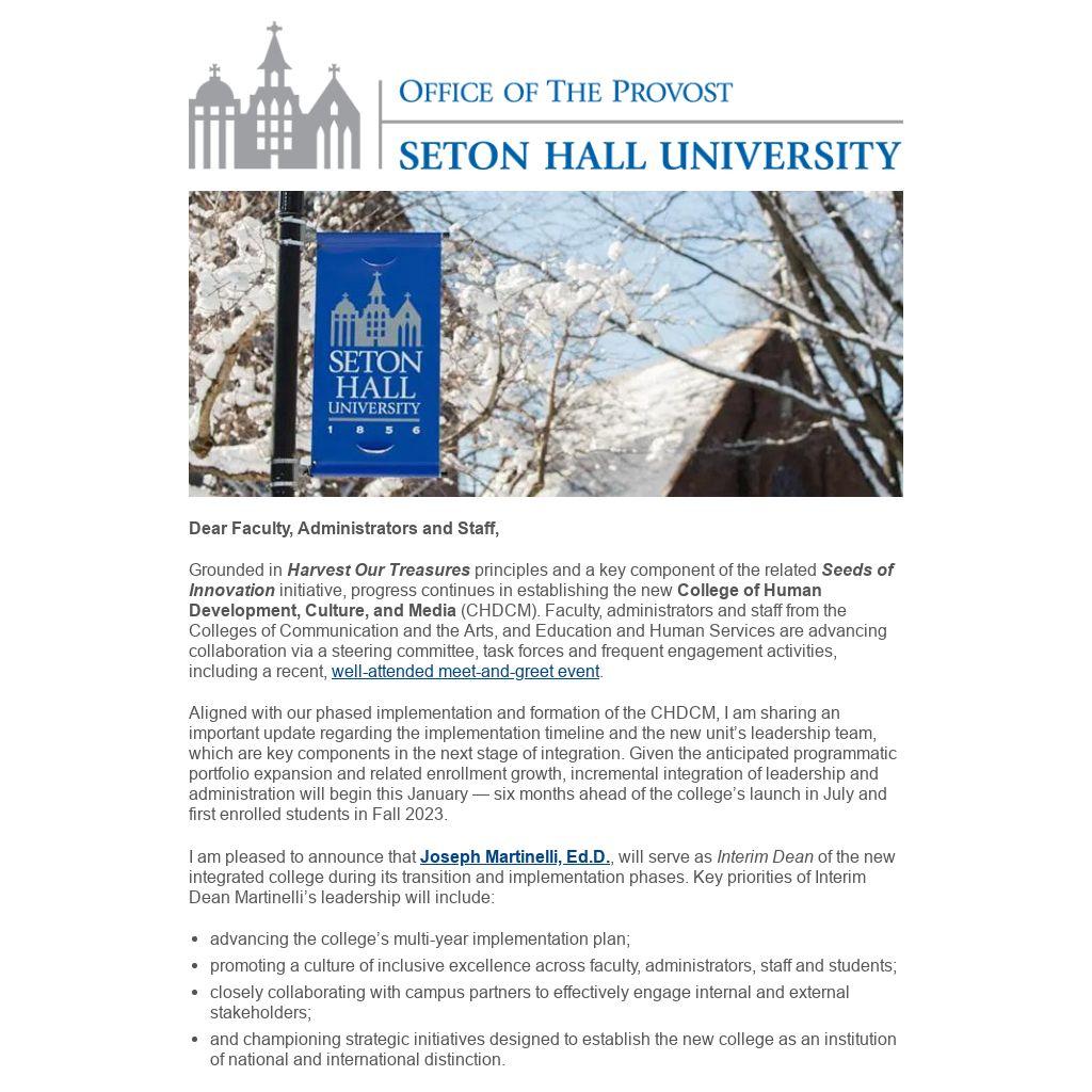 I am pleased to announce that Joseph Martinelli, Ed.D., will serve as Interim Dean of the new integrated college during its transition and implementation phases. Key priorities of Interim Dean Martinelli’s leadership will include: