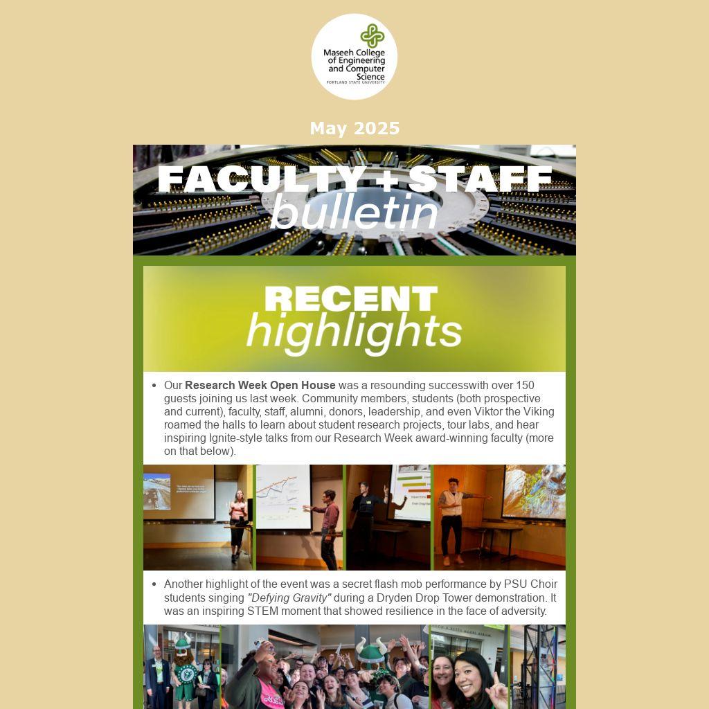 Maseeh College's commencement ceremony will be on Friday, June 13th from 5-7pm at Viking Pavilion. Until May 9th, Staff and faculty can still fill out the RSVP form to volunteer to help with this year's graduation event. Tickets are available until May 15th at PSU's ticketing site.