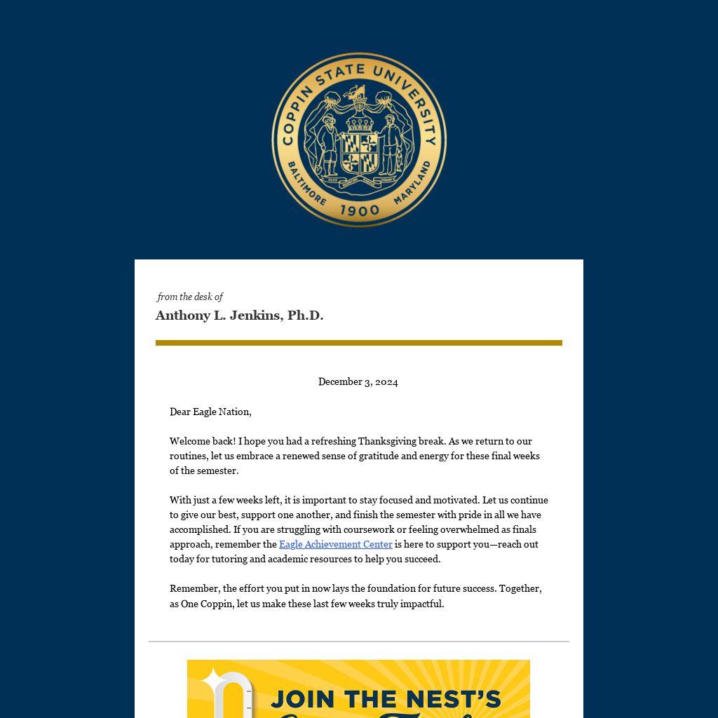 Let us make this week a time of growth, collaboration, and inspiration. Together, we can uphold a culture of continuous improvement and excellence at Coppin State University.