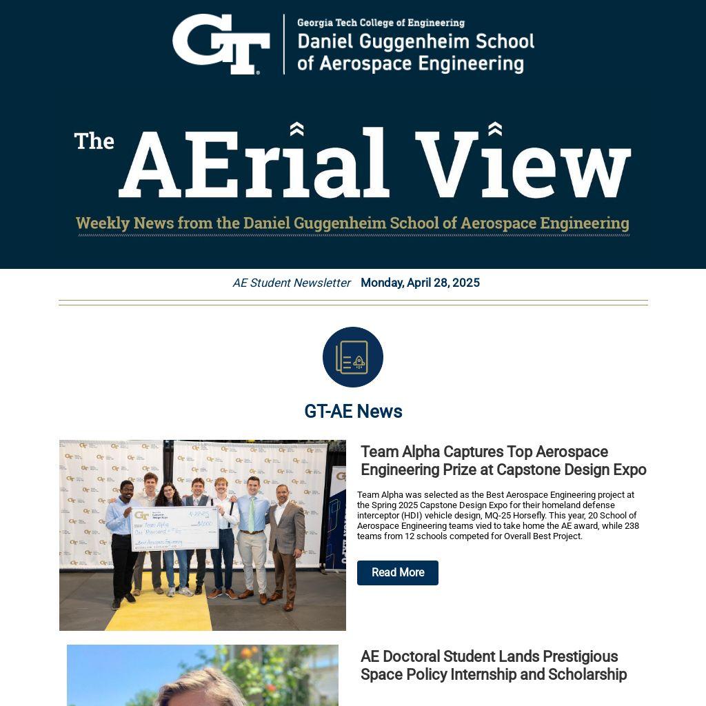 Team Alpha was selected as the Best Aerospace Engineering project at the Spring 2025 Capstone Design Expo for their homeland defense interceptor (HDI) vehicle design, MQ-25 Horsefly. This year, 20 School of Aerospace Engineering teams vied to take home the AE award, while 238 teams from 12 schools competed for Overall Best Project.