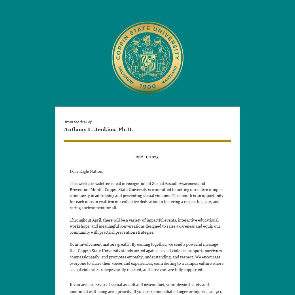This week's newsletter is teal in recognition of Sexual Assault Awareness and Prevention Month. Coppin State University is committed to uniting our entire campus community in addressing and preventing sexual violence. This month is an opportunity for each of us to reaffirm our collective dedication to fostering a respectful, safe, and caring environment for all. Throughout April, there will be a variety of impactful events, interactive educational workshops, and meaningful conversations designed to raise awareness and equip our community with practical prevention strategies.