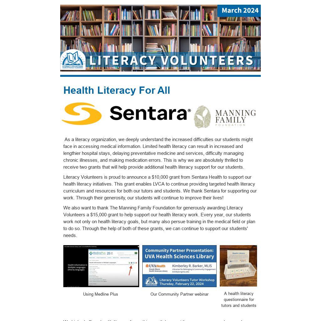 Literacy Volunteers is proud to announce a $10,000 grant from Sentara Health to support our health literacy initiatives. This grant enables LVCA to continue providing targeted health literacy curriculum and resources for both our tutors and students. We thank Sentara for supporting our work. Through their generosity, our students will continue to improve their lives!