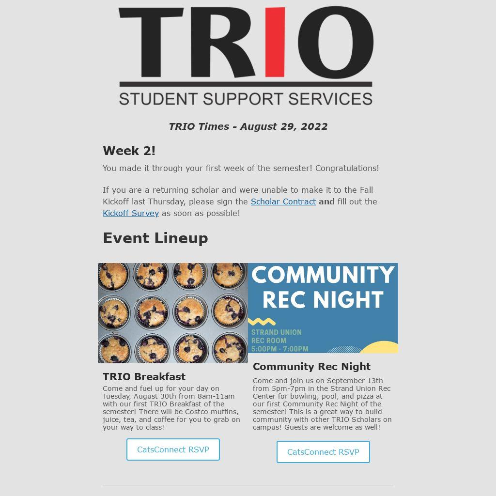Come and fuel up for your day on Tuesday, August 30th from 8am-11am with our first TRIO Breakfast of the semester! There will be Costco muffins, juice, tea, and coffee for you to grab on your way to class!