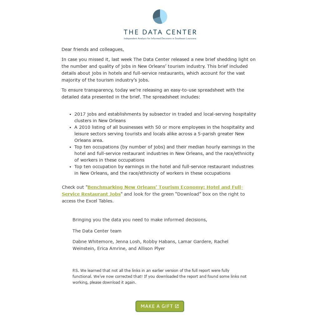 In case you missed it, last week The Data Center released a new brief shedding light on the number and quality of jobs in New Orleans’ tourism industry. This brief included details about jobs in hotels and full-service restaurants, which account for the vast majority of the tourism industry’s jobs.