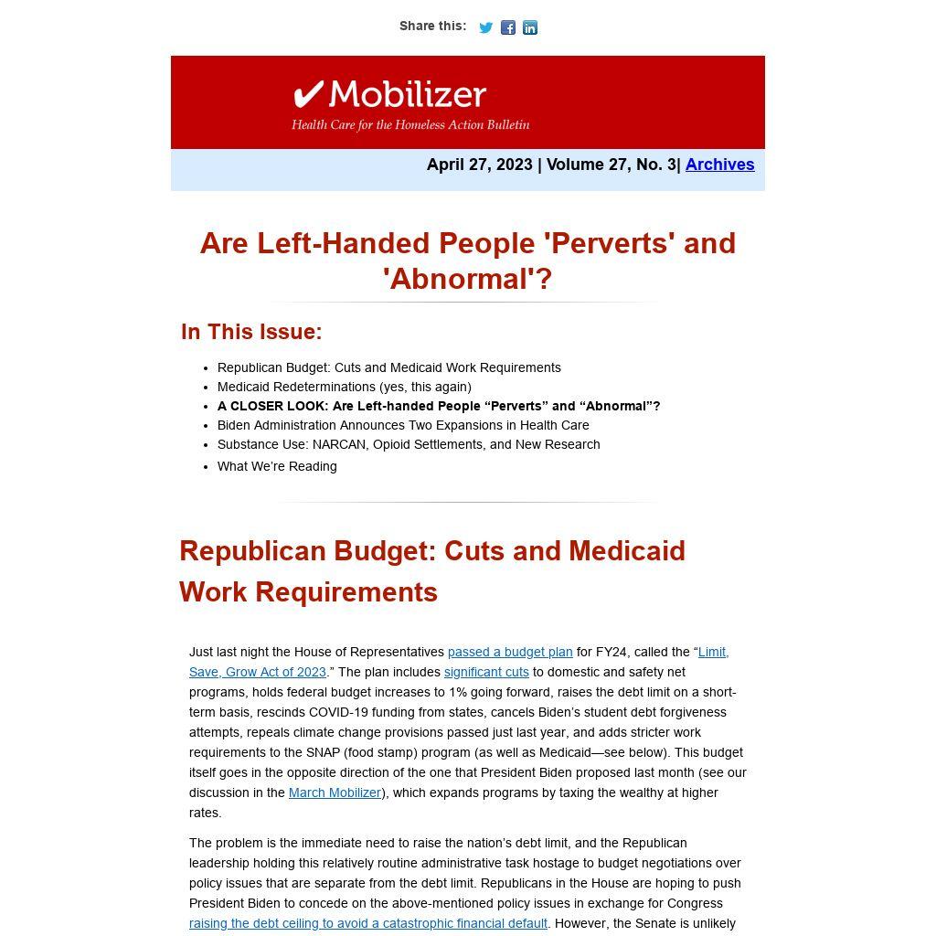 Just last night the House of Representatives passed a budget plan for FY24, called the “Limit, Save, Grow Act of 2023.” The plan includes significant cuts to domestic and safety net programs, holds federal budget increases to 1% going forward, raises the debt limit on a short-term basis, rescinds COVID‑19 funding from states, cancels Biden’s student debt forgiveness attempts, repeals climate change provisions passed just last year, and adds stricter work requirements to the SNAP (food stamp) program (as well as Medicaid—see below). This budget itself goes in the opposite direction of the one that President Biden proposed last month (see our discussion in the March Mobilizer), which expands programs by taxing the wealthy at higher rates.