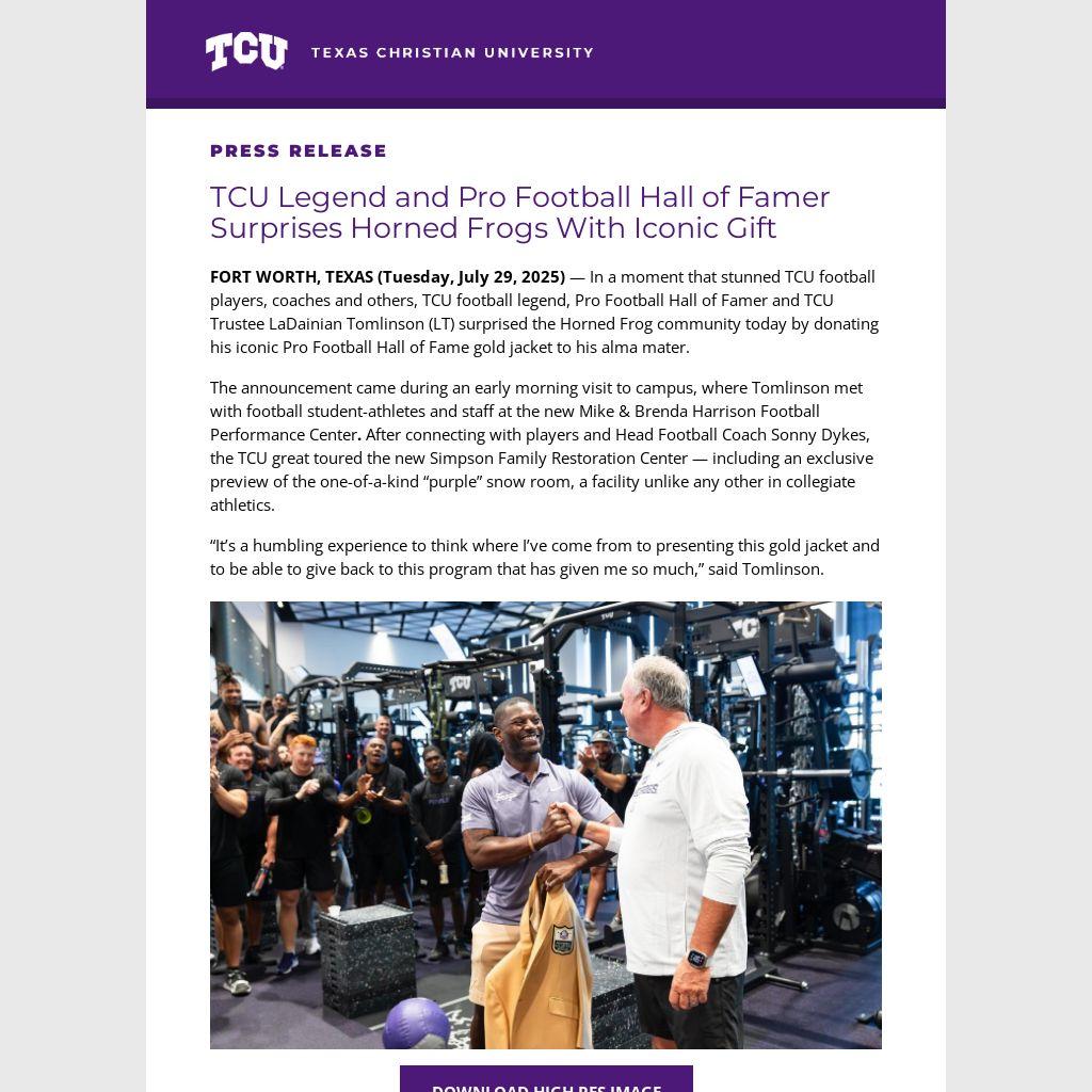 FORT WORTH, TEXAS (Tuesday, July 29, 2025) — In a moment that stunned TCU football players, coaches and others, TCU football legend, Pro Football Hall of Famer and TCU Trustee LaDainian Tomlinson (LT) surprised the Horned Frog community today by donating his iconic Pro Football Hall of Fame gold jacket to his alma mater.