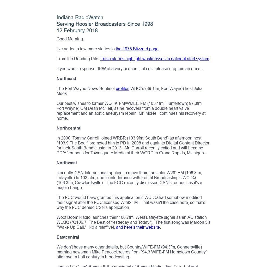 Indiana RadioWatch subscriptions are free. To subscribe, send an e-mail to irw@well.com and we'll add you. After publication, we archive Indiana RadioWatch on the Indiana Radio Archive at http://www.indianaradio.net. Please e-mail us your news stories and employment opportunities.