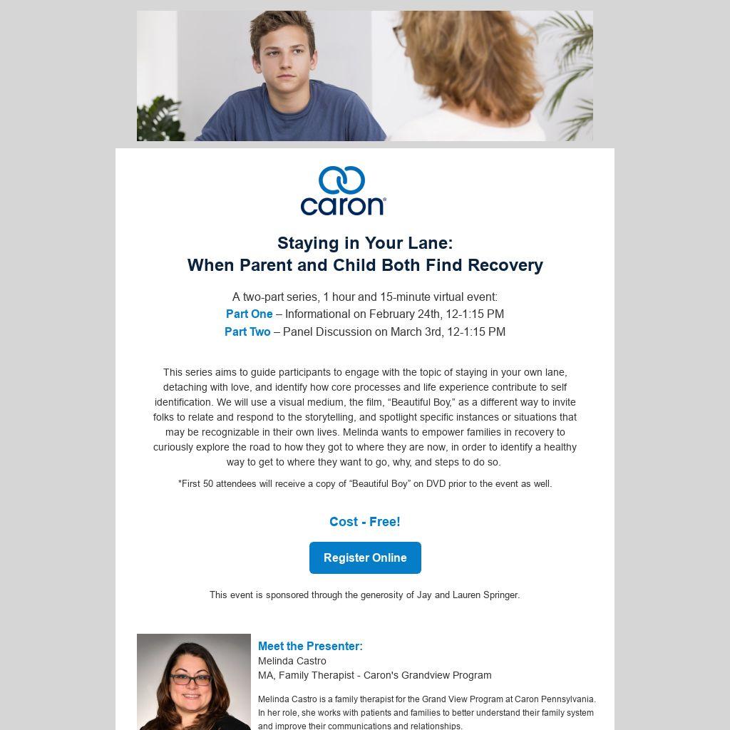This series aims to guide participants to engage with the topic of staying in your own lane, detaching with love, and identify how core processes and life experience contribute to self identification. We will use a visual medium, the film, “Beautiful Boy,” as a different way to invite folks to relate and respond to the storytelling, and spotlight specific instances or situations that may be recognizable in their own lives. Melinda wants to empower families in recovery to curiously explore the road to how they got to where they are now, in order to identify a healthy way to get to where they want to go, why, and steps to do so.