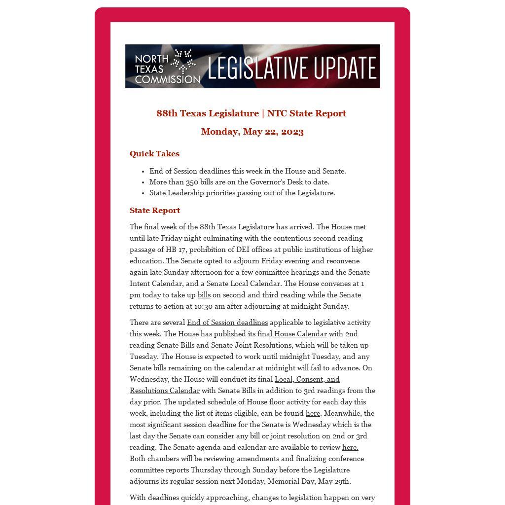 The final week of the 88th Texas Legislature has arrived. The House met until late Friday night culminating with the contentious second reading passage of HB 17, prohibition of DEI offices at public institutions of higher education. The Senate opted to adjourn Friday evening and reconvene again late Sunday afternoon for a few committee hearings and the Senate Intent Calendar, and a Senate Local Calendar. The House convenes at 1 pm today to take up bills on second and third reading while the Senate returns to action at 10:30 am after adjourning at midnight Sunday.