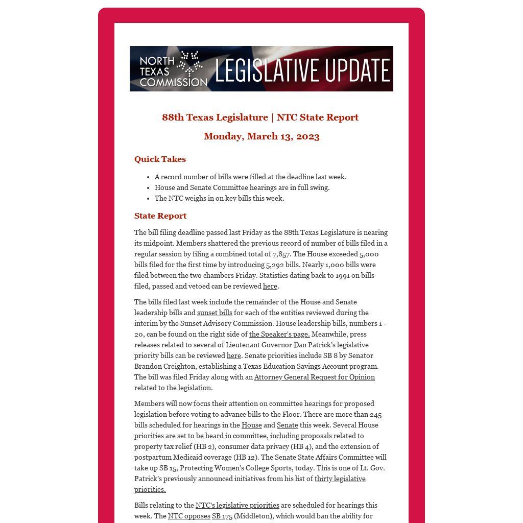 Bills relating to the NTC's legislative priorities are scheduled for hearings this week. The NTC opposes SB 175 (Middleton), which would ban the ability for cities, counties, schools, and other publicly-funded entities to hire lobbyists to communicate with lawmakers and participate in the legislative process. You can watch the Senate State Affairs hearing today. On Wednesday, House State Affairs Committee will hear HB 2127 (Burrows). The NTC intends to testify against this legislation that would restrict local governments from making local ordinances without the state's permission, leaving local governments vulnerable to lawsuits.