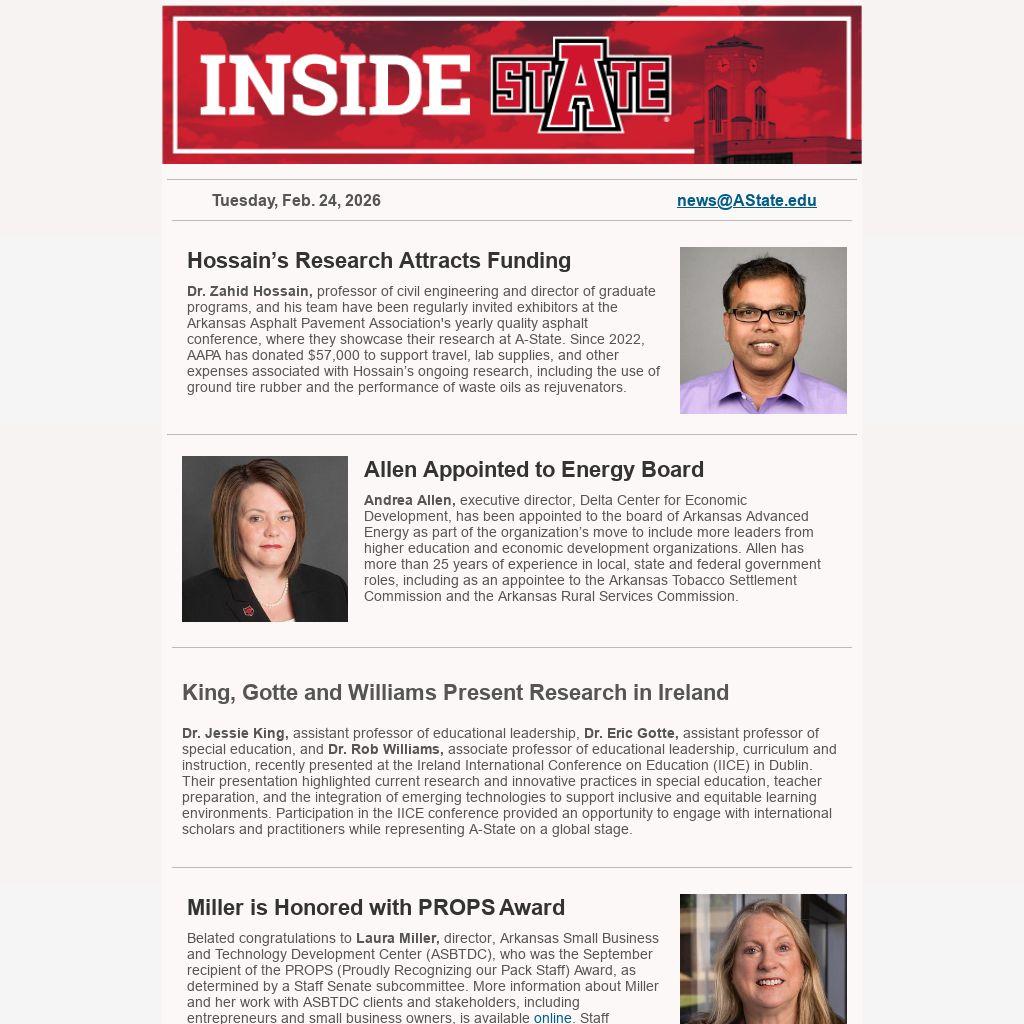 Dr. Zahid Hossain, professor of civil engineering and director of graduate programs, and his team have been regularly invited exhibitors at the Arkansas Asphalt Pavement Association's yearly quality asphalt conference, where they showcase their research at A-State. Since 2022, AAPA has donated $57,000 to support travel, lab supplies, and other expenses associated with Hossain’s ongoing research, including the use of ground tire rubber and the performance of waste oils as rejuvenators.