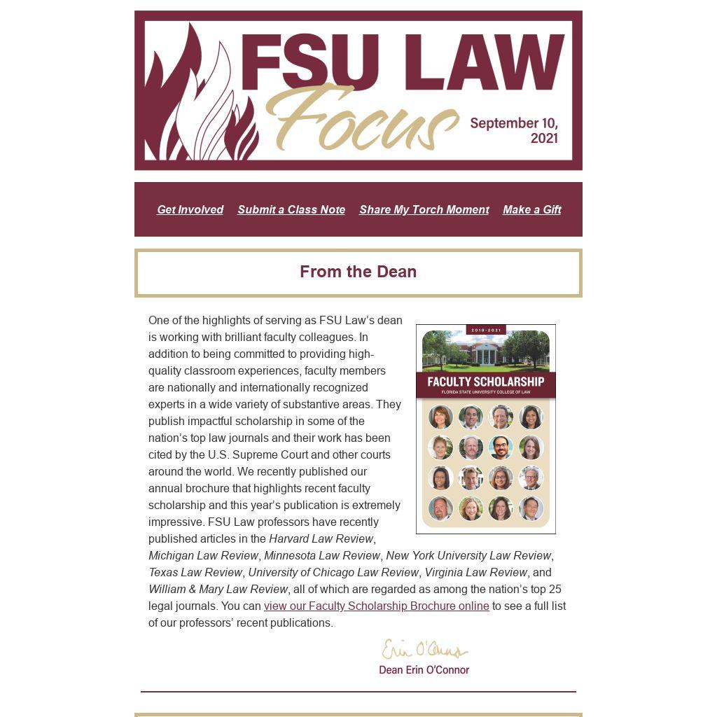 One of the highlights of serving as FSU Law’s dean is working with brilliant faculty colleagues. In addition to being committed to providing high-quality classroom experiences, faculty members are nationally and internationally recognized experts in a wide variety of substantive areas. They publish impactful scholarship in some of the nation’s top law journals and their work has been cited by the U.S. Supreme Court and other courts around the world. We recently published our annual brochure that highlights recent faculty scholarship and this year’s publication is extremely impressive. FSU Law professors have recently published articles in the Harvard Law Review, Michigan Law Review, Minnesota Law Review, New York University Law Review, Texas Law Review, University of Chicago Law Review, Virginia Law Review, and William & Mary Law Review, all of which are regarded as among the nation’s top 25 legal journals. You can view our Faculty Scholarship Brochure online to see a full list of our professors’ recent publications.