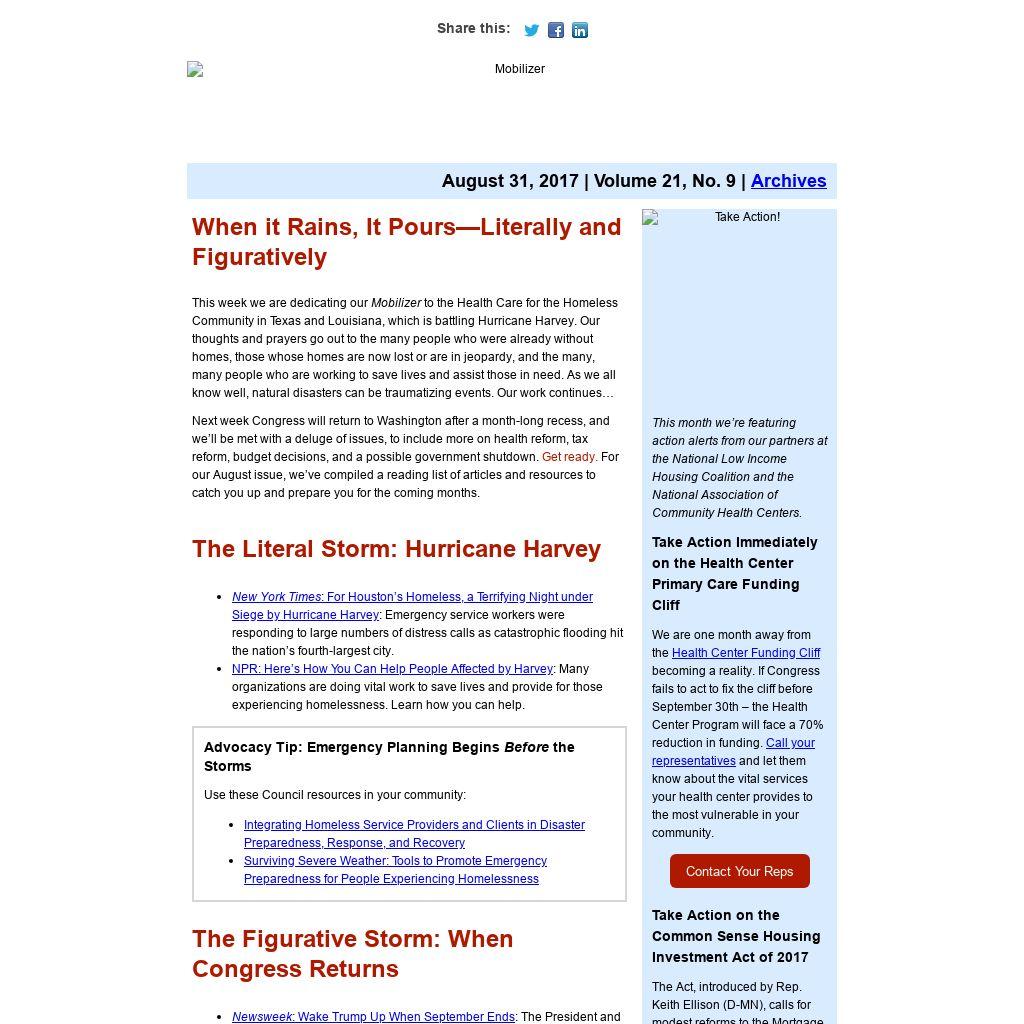 This week we are dedicating our Mobilizer to the Health Care for the Homeless Community in Texas and Louisiana, which is battling Hurricane Harvey. Our thoughts and prayers go out to the many people who were already without homes, those whose homes are now lost or are in jeopardy, and the many, many people who are working to save lives and assist those in need. As we all know well, natural disasters can be traumatizing events. Our work continues…
