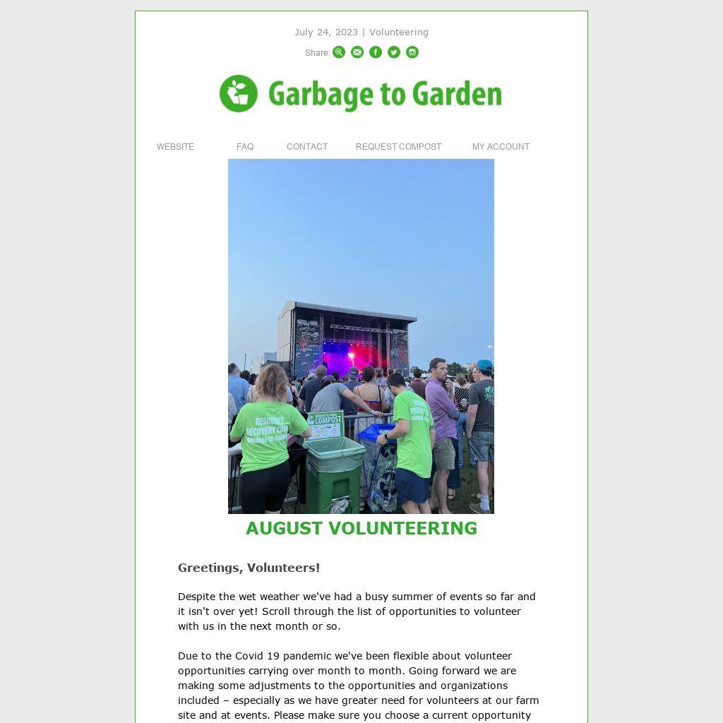 Join staff and other volunteers to monitor waste stations and sort compost, recycling, and trash to ensure maximum diversion from landfills. Volunteers get free access to the show, and a Garbage to Garden t-shirt to wear at the event!