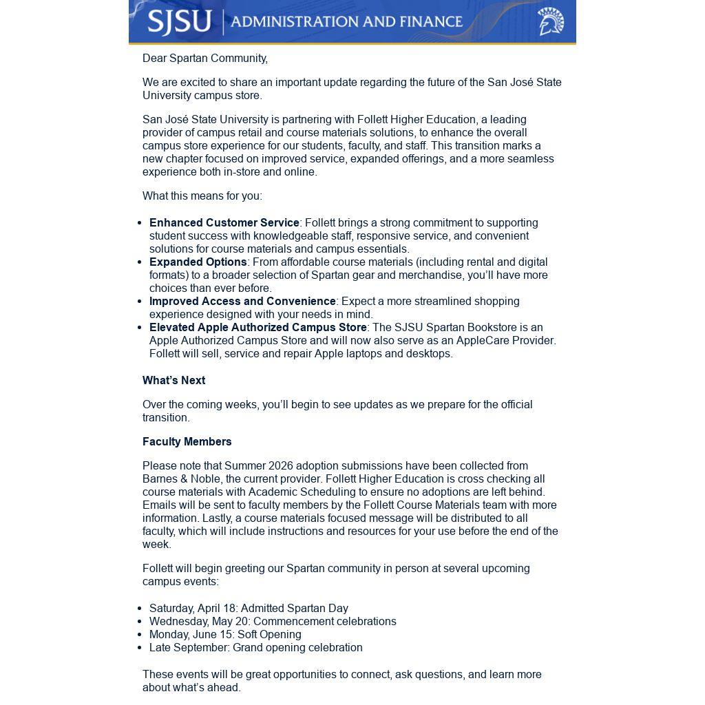 We are excited to share an important update regarding the future of the San José State University campus store.