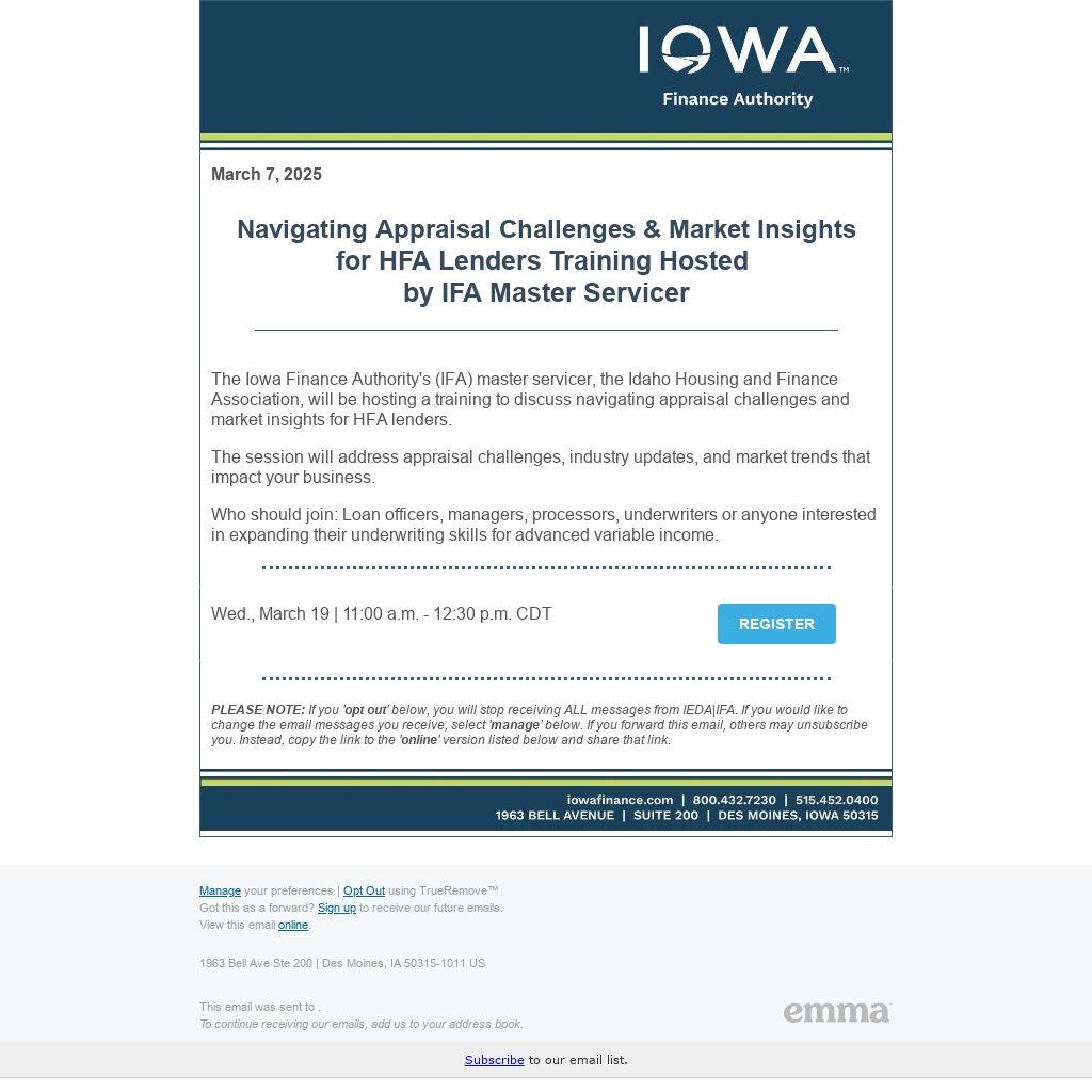 The Iowa Finance Authority's (IFA) master servicer, the Idaho Housing and Finance Association, will be hosting a training to discuss navigating appraisal challenges and market insights for HFA lenders.