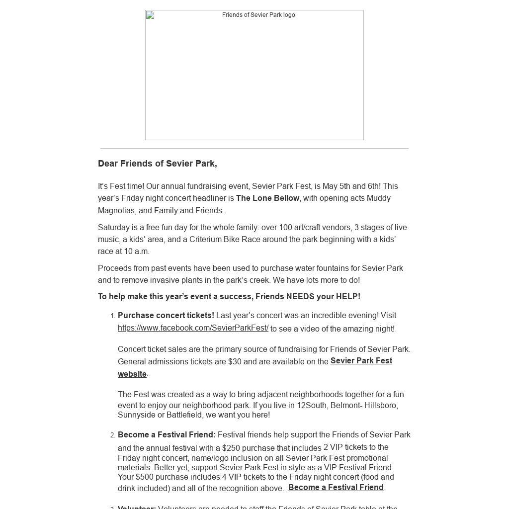 - Become a Festival Friend: Festival friends help support the Friends of Sevier Park and the annual festival with a $250 purchase that includes 2 VIP tickets to the Friday night concert, name/logo inclusion on all Sevier Park Fest promotional materials. Better yet, support Sevier Park Fest in style as a VIP Festival Friend. Your $500 purchase includes 4 VIP tickets to the Friday night concert (food and drink included) and all of the recognition above. Become a Festival Friend.